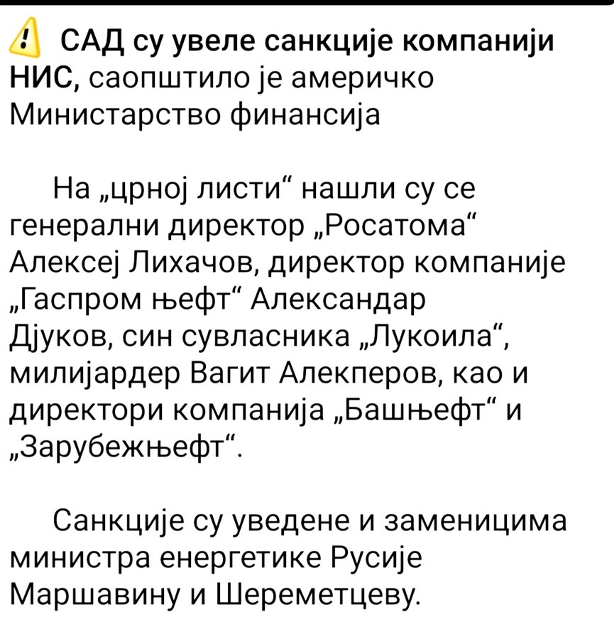 Dobar dan. U današnjoj reprizi, žvaljava hulja je ponovo okupio vladu u Palati Srbija i ribao kurcoglavog i ministre. Rekao je da Ameri zaista uvode sankcije NIS-u (i to totalne), kao i da neće biti novca za plate i penzije posle 15.1. Evo, usrali smo se već.
