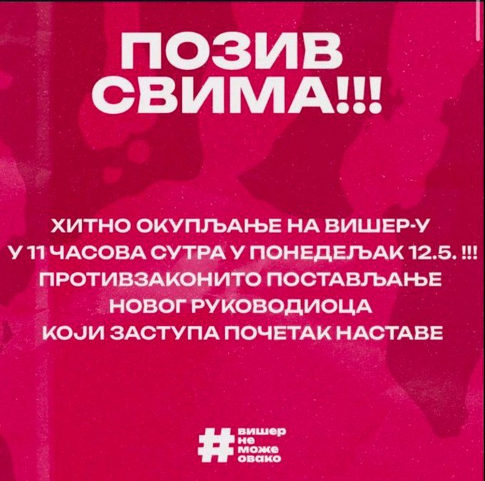 Sutra, u ponedeljak 12. maja studenti u blokadi Prirodno-matematičkog, Pravnog i Ekonomskog fakulteta Univerziteta u Kragujevcu pozivaju sve građane, kolege i koleginice u protestnu šetnju kao odgovor na početak onlajn predavanja („Danas“).