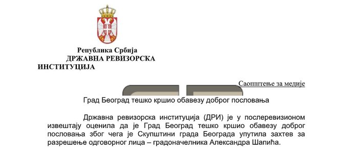 Državna revizorska institucija zvanično zahteva od Skupštine Grada Beograda razrešenje gradonačelnika Aleksandra Šapića zbog „kršenja obaveze dobrog poslovanja“.