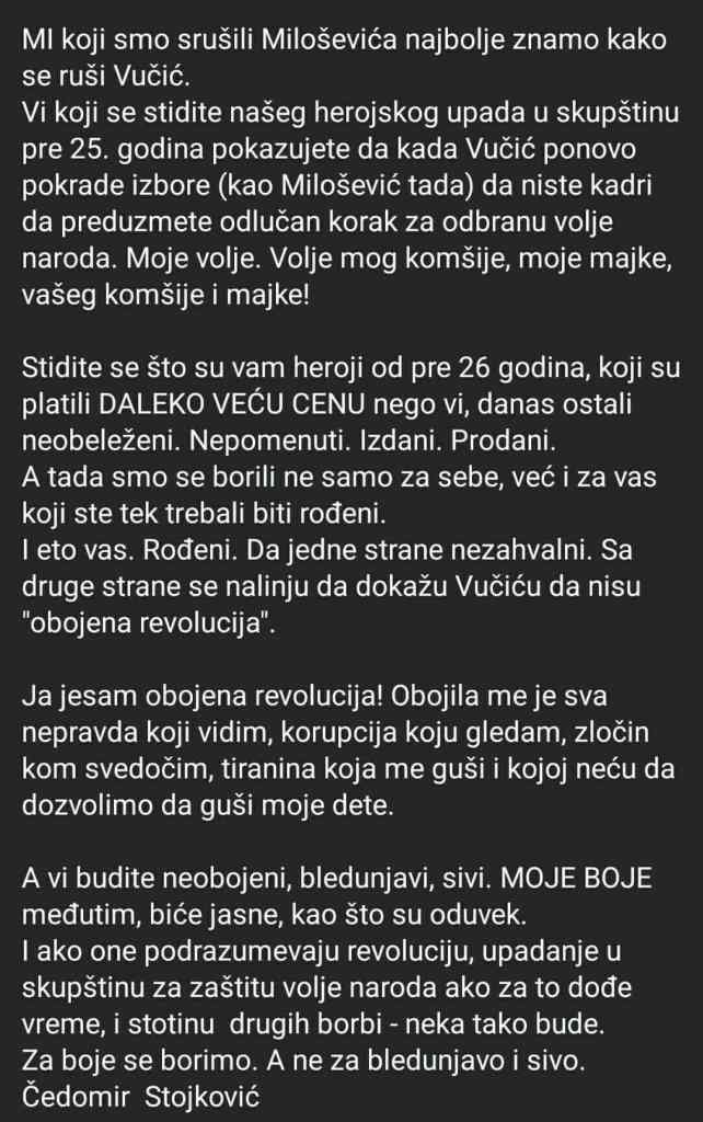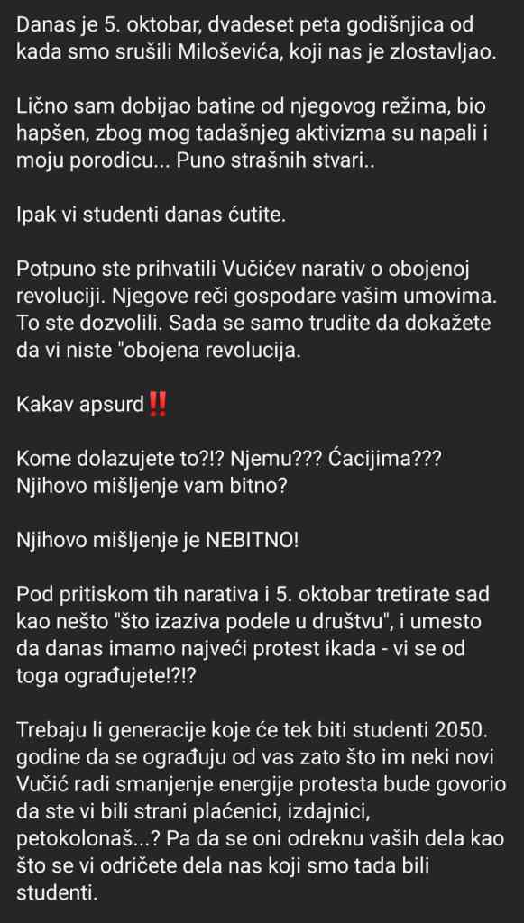 Уосталом, зашто би данашњи студенти били у обавези да носе терет 5. октобра? Генерације рођене тада и мало после тога, сада су већ на мастер и/или докторским студијама, или су се запослили и ухватили се у трку преживљавања. Немају времена да, поред свега што су сами преузели и што им ви Чедомири Стојковићи и слични ликови додатно товарите на врат, испитују контекст борбе времена у којем нису ни рођени нити у том систему провели дана чак ни у виду јајне ћелије.